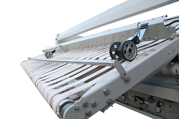 1、電腦板智能選擇折疊折數,可達到兩橫三縱共五折的折疊功能。更大折疊范圍3000*3000mm,可與不同型號的燙平機配套使用,達到自動折疊各種布草的效果。